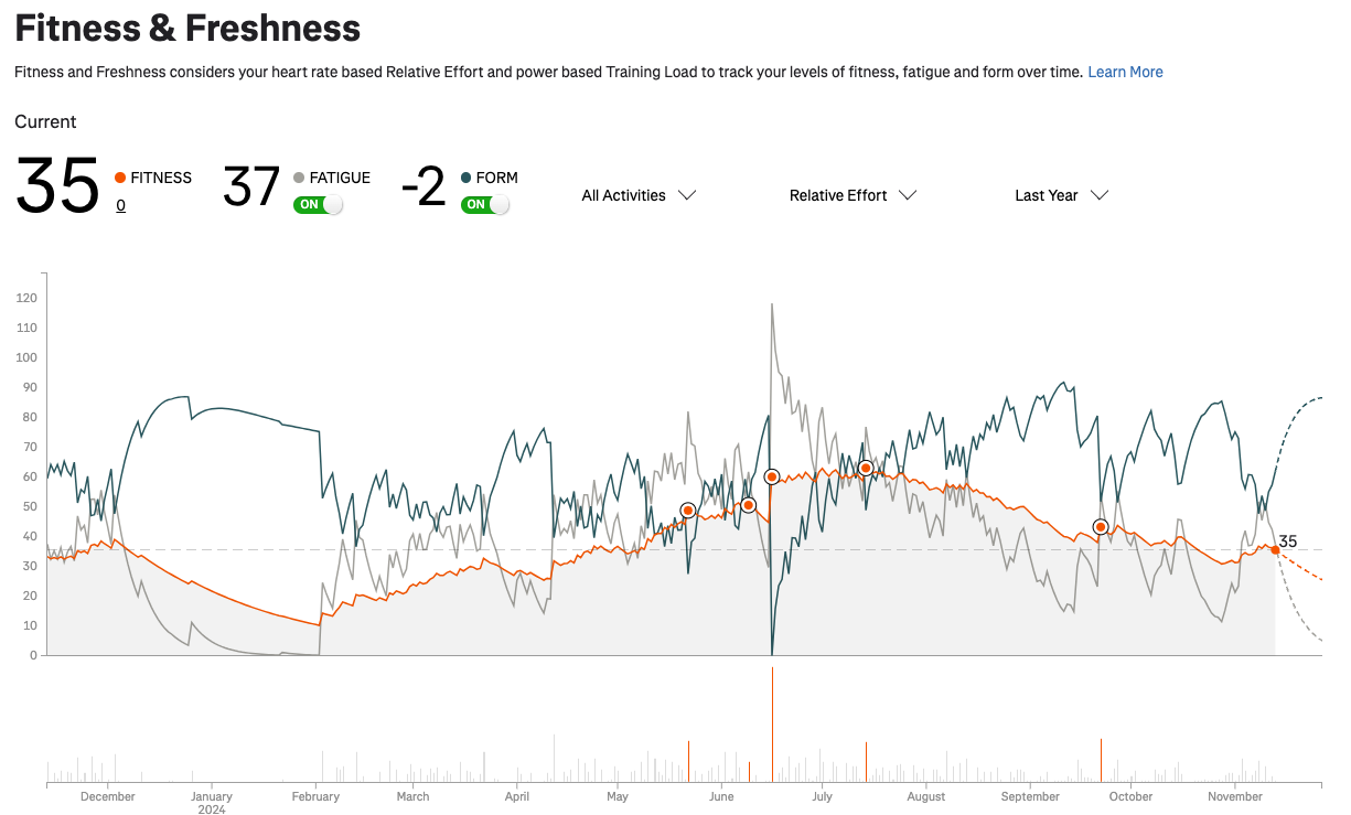 Form is the state we reach when fitness and fatigue align. It represents our readiness to perform at our best. High fatigue lowers our form, making us feel sluggish, less capable, and, more concerning, injury prone. When we balance fatigue with proper recovery, our form improves, leaving us feeling fresh and prepared for more intense sessions like races or threshold workouts. Form is typically at its best for training when it’s in a slightly negative to neutral range. This balance means you have accumulated some fatigue from recent workouts, indicating your body is actively adapting, but you’re not overly fatigued to the point of risking burnout or injury.